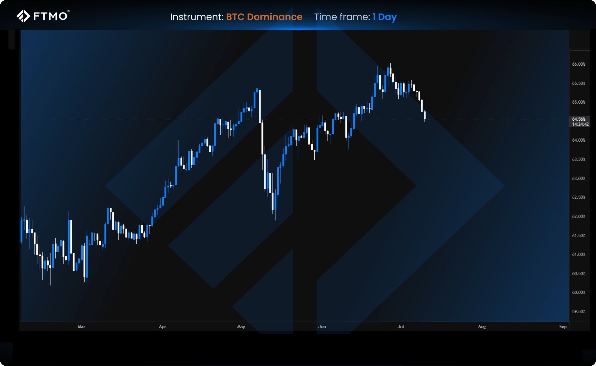 Dominance bitcoinu se aktuálně pohybuje okolo 64 %. Historicky platí, že pokles pod hranici 60 % často značí začátek altseason, kdy se kapitál přelévá z BTC do altcoinů. Podobné průlomy nastartovaly výrazné rally altcoinů v letech 2017–2018 a 2020–2021.
