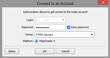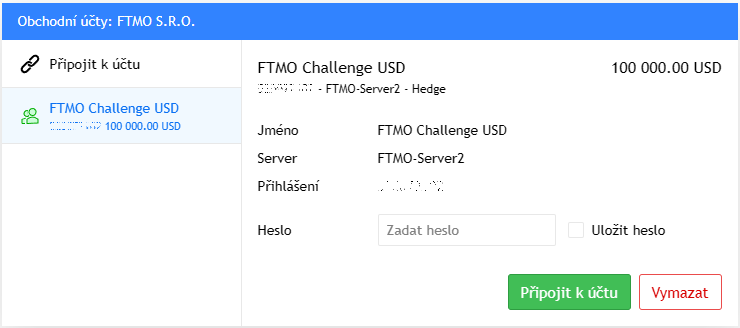 Vždy, když vám FTMO vytvoří nový účet (FTMO Challenge, Verifikaci nebo FTMO Account), objeví se vám v Přehledu účtů nové přihlašovací údaje. To samé vám pak dorazí do e-mailové schránky. Při přihlašování do účtů na platformách MetaTrader4, MetaTrader5 a DXtrade je potřeba vždy nově zadávat tyto nové přihlašovací údaje podle tohoto návodu.
