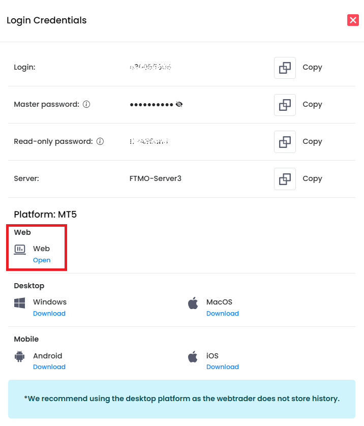 V tomto okně úplně dole je kolonka Web, v níž kliknete na tlačítko Otevřít. Dalším způsobem je otevření adresy https://mt4.ftmo.com/. V obou případech se vám zobrazí přihlašovací okno.