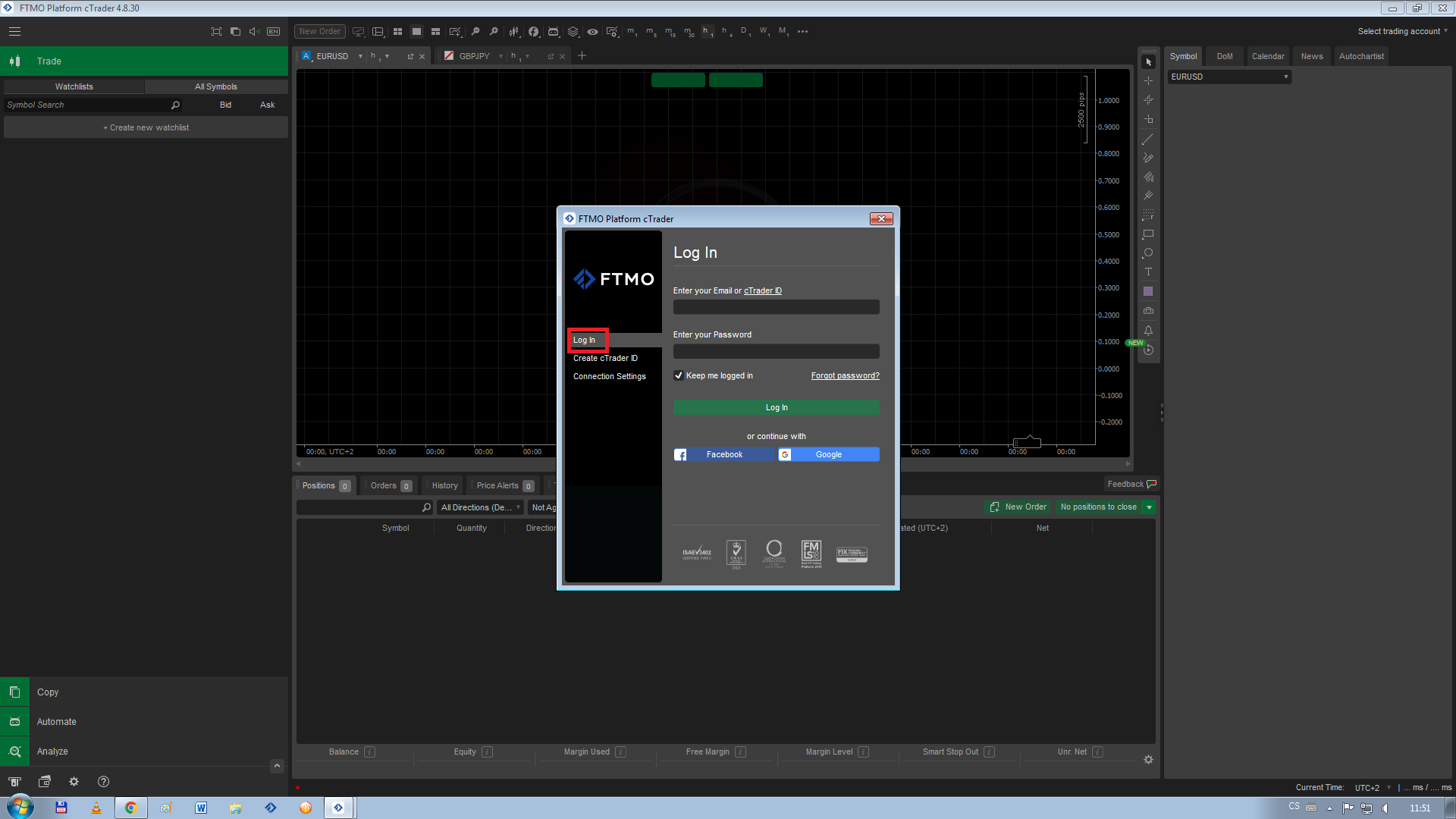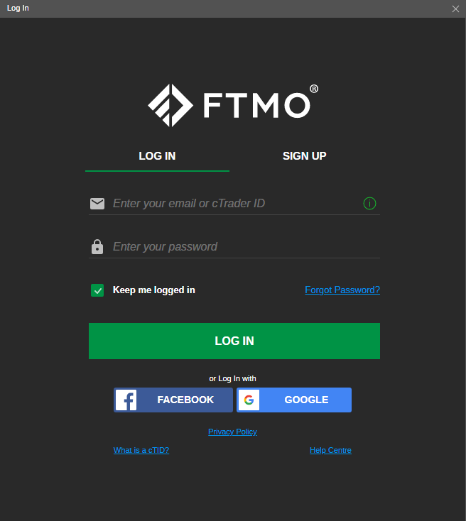Po stažení aplikace na webu FTMO a jejím otevření se vám ukáže základní okno aplikace s výzvou k přihlášení (Log In). Do kolonek pak vyplníte své cTrader ID a heslo, které jste si vytvořili po otevření účtu, a které vám přišlo e-mailem. Po kliknutí na zelené tlačítko Log In se aplikace rozběhne a vy můžete obchodovat.
