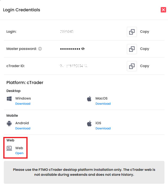 FTMO svým klientům nabízí také možnost obchodovat prostřednictvím webové platformy. Ta má sice omezené možnosti, ale toto řešení může vyhovovat těm klientům, kteří si z jakéhokoli důvodu nepřejí instalovat desktopovou platformu do svého PC. Doporučujeme však používat desktopovou platformu, protože web-trader neukládá historii.