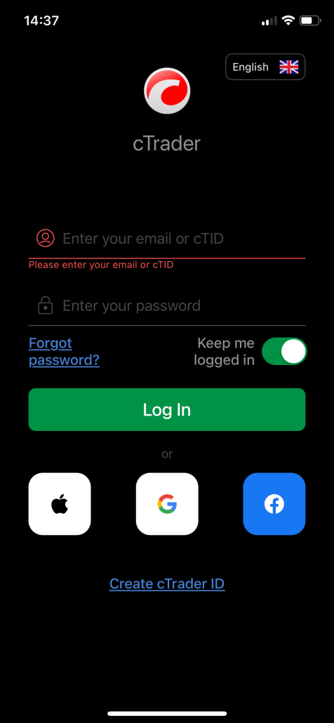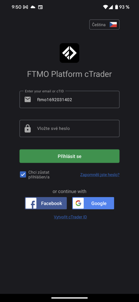Vzhledem k tomu, že v aplikaci cTrader není potřeba zadávat různé servery, je přihlášení poměrně jednoduché.