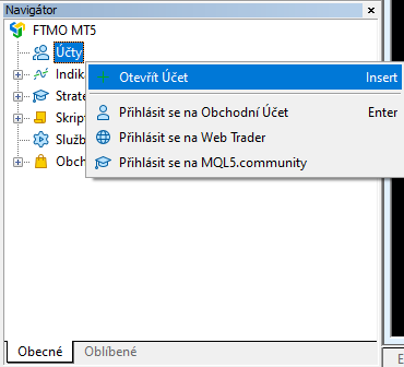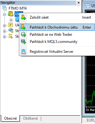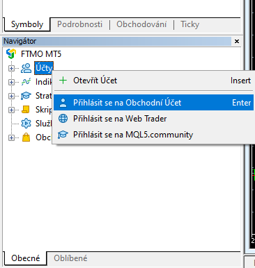 Druhou možnost najdete v okně Navigátor, kde kliknete pravým tlačítkem myši na Kartu Účty - Přihlásit se na obchodní účet.