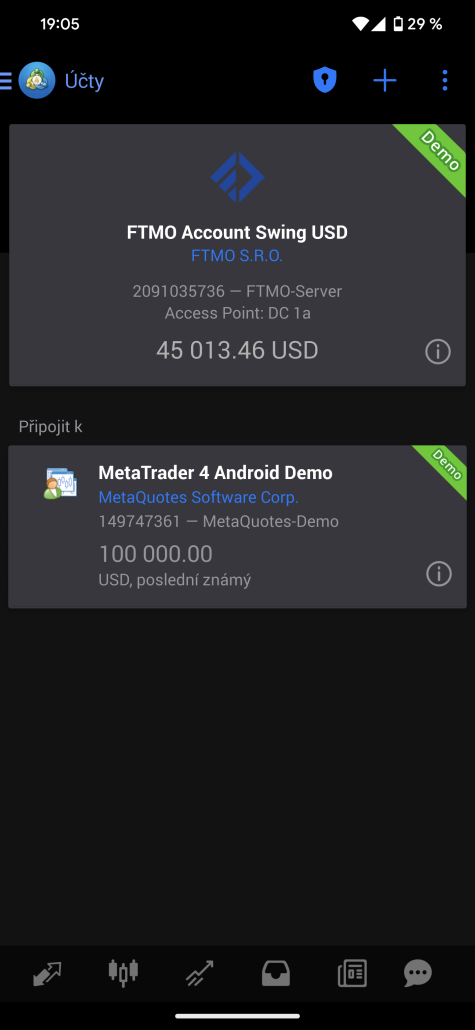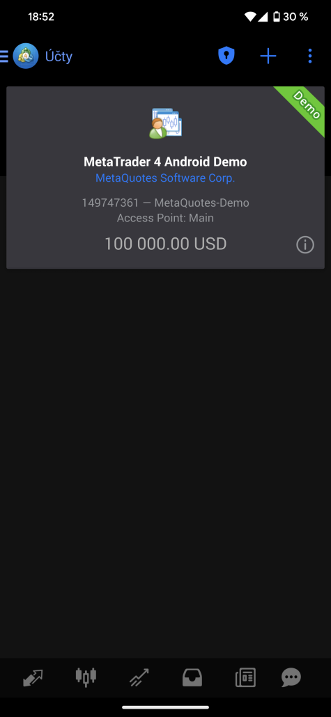 V dalším okně se vám objeví zmiňovaný předinstalovaný demo účet a vy kliknete na znak plus vpravo nahoře.