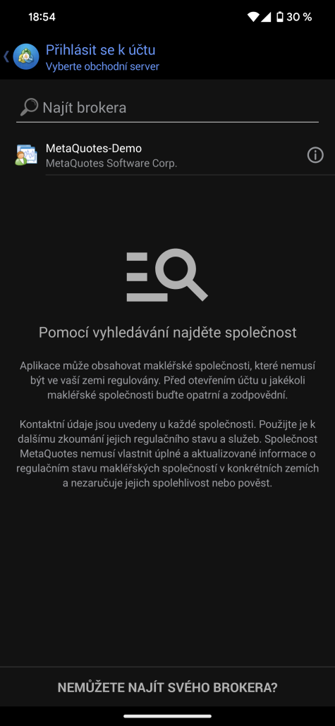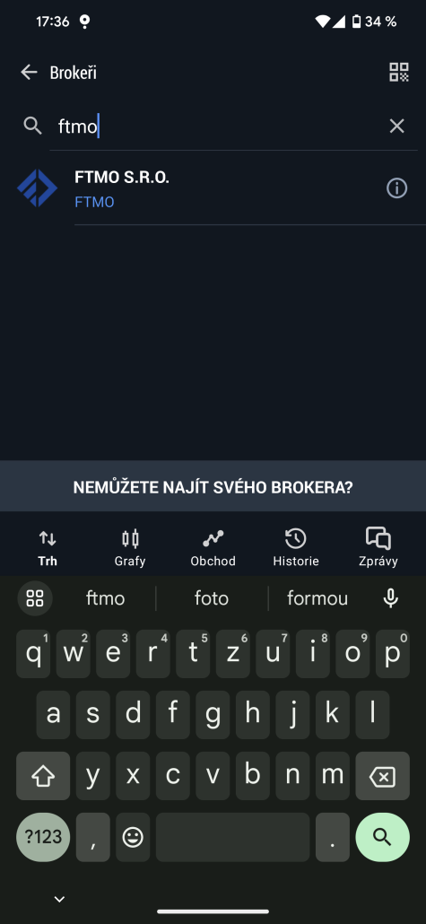 V dalším okně musíte zadat název FTMO do kolonky Najít brokera.