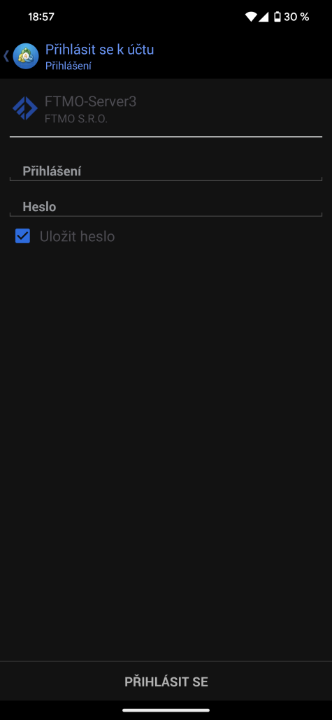 Po kliknutí na FTMO S.R.O. se dostanete do přihlašovacího okna, kde vyplníte údaje (Přihlášení a Heslo) a z nabídky serverů vyberete správný server, jehož název jste dostali společně s přihlašovacími údaji a kliknete na tlačítko Přihlášení. Doporučujeme využít možnost Kopírovat v okně Přihlašovací údaje a vložit údaje prostřednictvím možnosti vložit.
