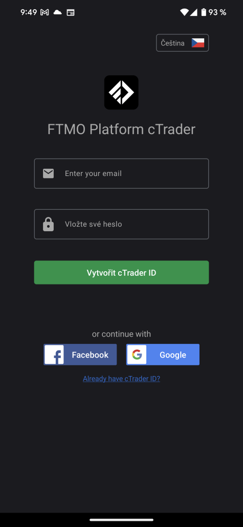 Po otevření okna aplikace si můžete nastavit jazyk vpravo nahoře, ve výběru je i čeština. Jako první se vám objeví okno s možností vytvoření nového cTrader ID. Jelikož své cTrader už máte, kliknete na možnost Already have cTrader ID?