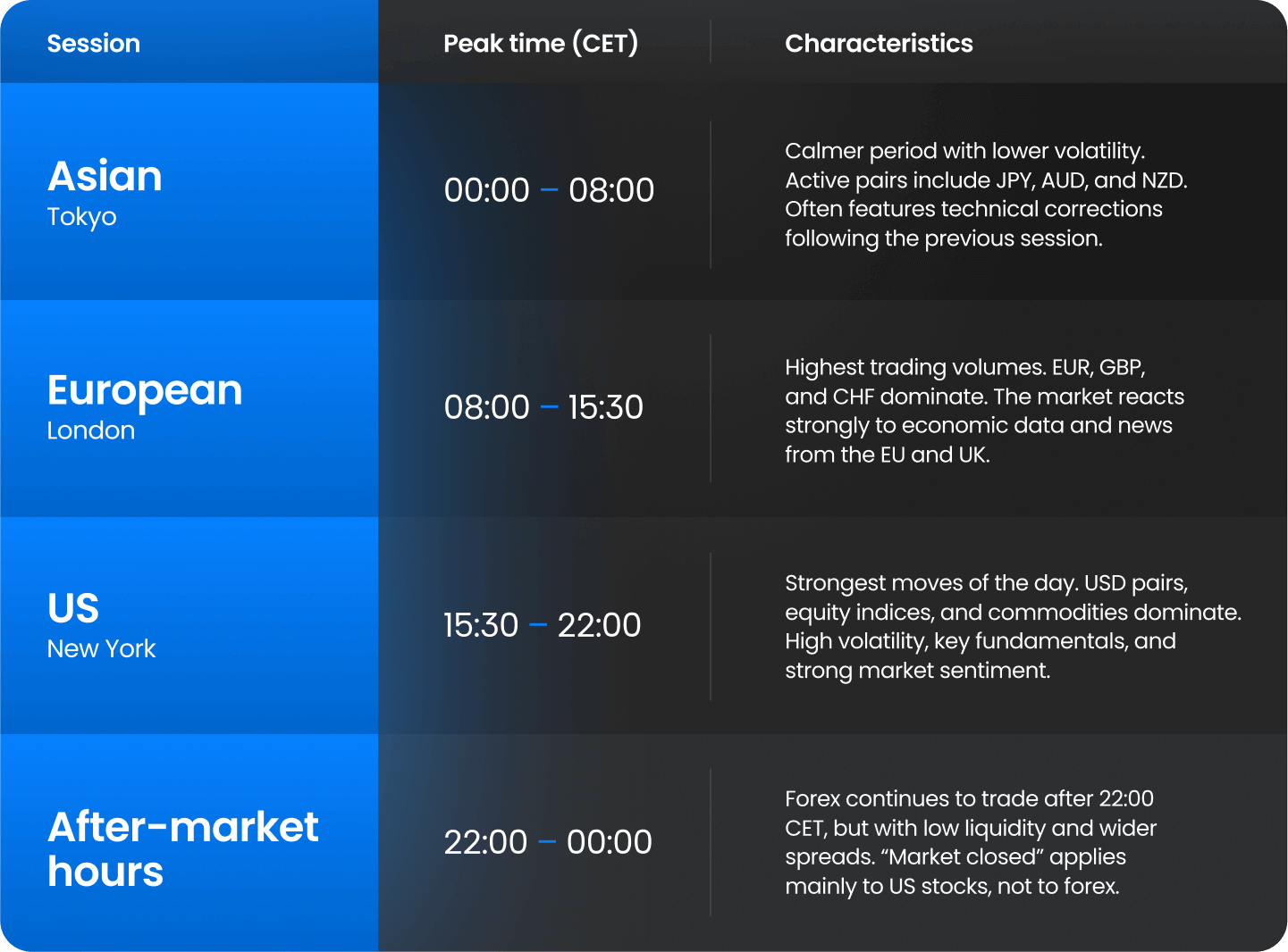 Každý obchodní den se řídí rytmem největších světových finančních center. Aktivita vrcholí v různých časech a každá seance je ovlivněna tržními faktory a likviditou svého regionu. Následující tabulka ukazuje hlavní seance a zvýrazňuje, kdy aktivita obvykle dosahuje vrcholu. Pochopení těchto vzorců vám pomůže načasovat vstupy do obchodů na období s vyšší volatilitou a lepšími příležitostmi.