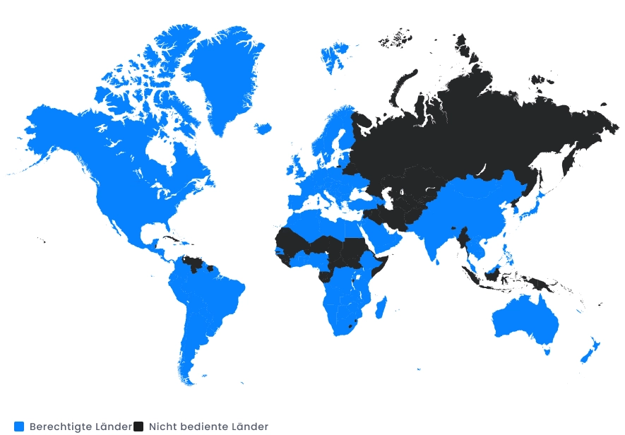 Die bereitgestellte Karte zeigt die Verfügbarkeit unseres Services, wobei die in Frage kommenden Länder blau hervorgehoben sind. Diese Darstellung unterliegt internen Geschäftsentscheidungen und Änderungen in Übereinstimmung mit den sich entwickelnden rechtlichen und regulatorischen Standards:
