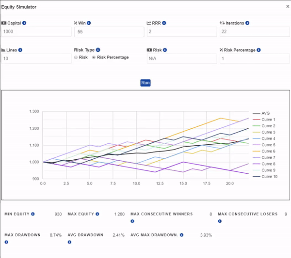 Well let's take a look at our FTMO Equity Simulator where we put starting capital at $1000 and we performed to test for 10 different scenarios where your win rate is 55% with risk:reward ratio set at 2, risk percentage 1% per trade and 22 trades taken, so you would have to take at least 1 trade each day for a whole month.