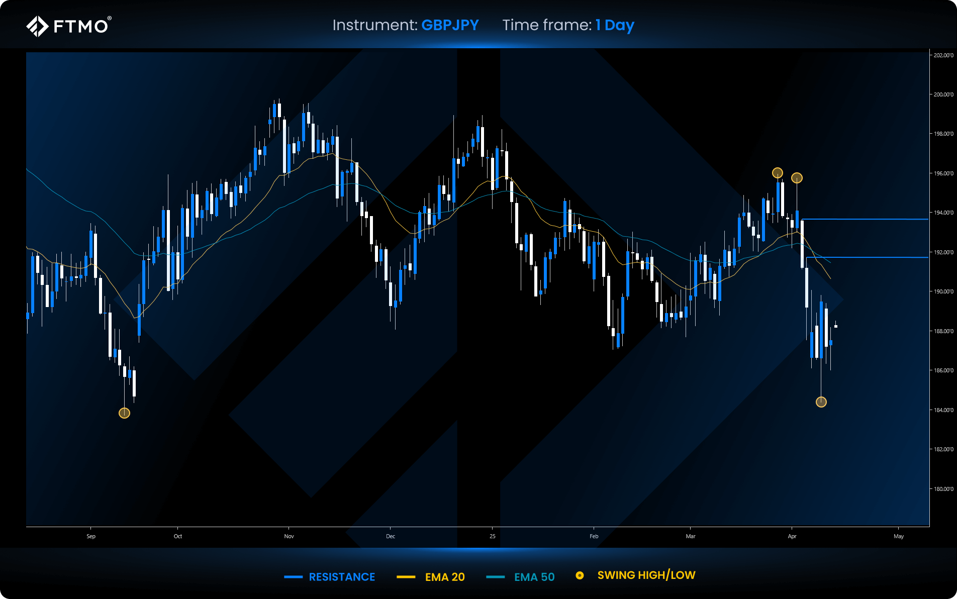Market Context: Despite increased volatility last week, GBPJPY remained in a consolidation phase within a broader bearish structure, as confirmed by its position below the 20 EMA and 50 EMA. Price movement was limited, and the previously monitored short-term imbalance zone (FVG) did not influence price direction in a meaningful way.