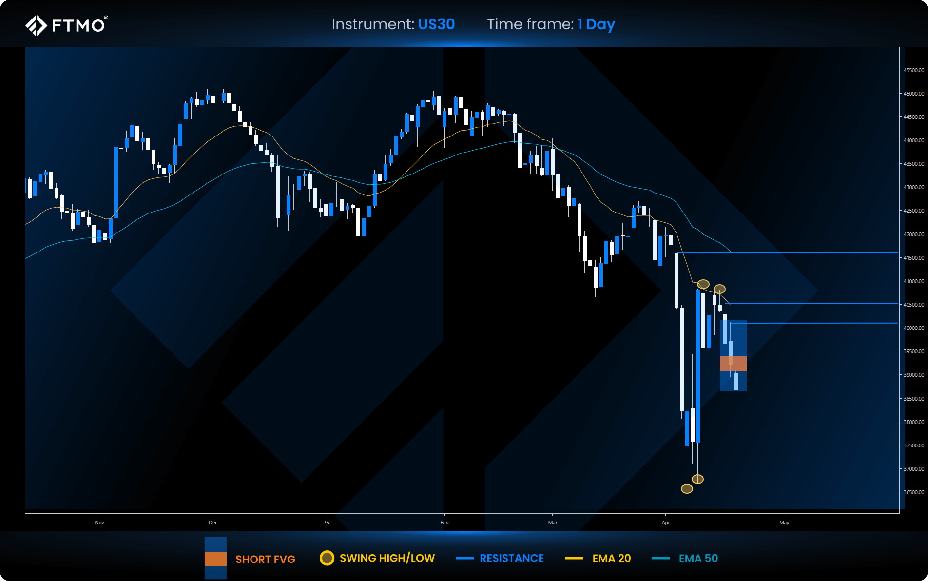 Market Context: US30 is in a confirmed downtrend, with price trading below both the 20 and 50 EMA, a clear indication of bearish market structure.