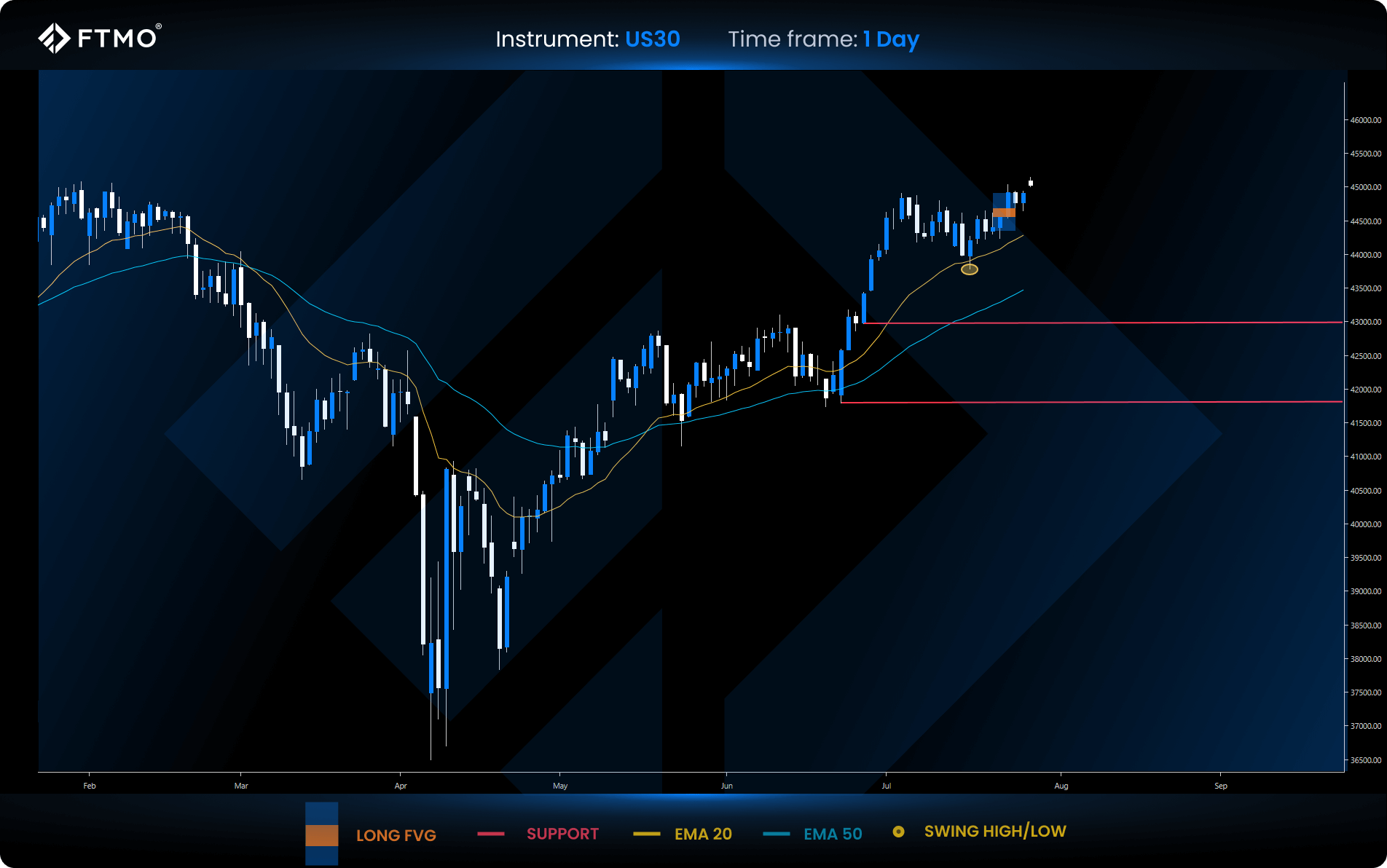 Market Context: Early-week gains triggered an overnight gap as bullish sentiment returned to the index. Technical structure remains supportive, and historical August performance suggests continued upward potential.
