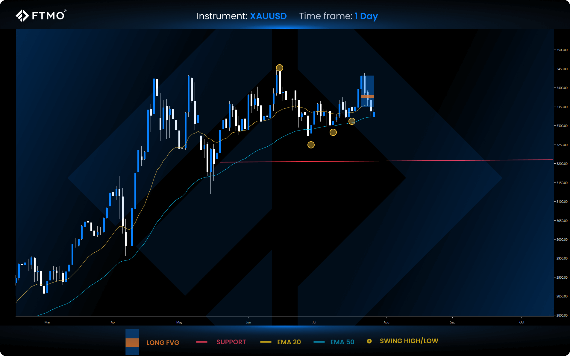 Bearish Scenario (Alternative): A daily close below the FVG would invalidate its role as support and expose the next downside liquidity zone.