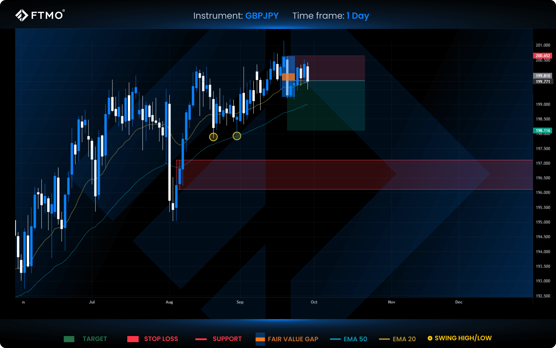 This trading approach leverages the 20- and 50-period Exponential Moving Averages (EMAs) to assess the prevailing market trend, while the Fair Value Gap (FVG) is used to pinpoint zones of price inefficiency. These gaps, formed during sharp price movements, often highlight optimal entry or exit levels. The strategy is suitable for instruments like EURUSD, GBPJPY, US30, and XAUUSD and provides insights into both last week’s market opportunities and the current one.