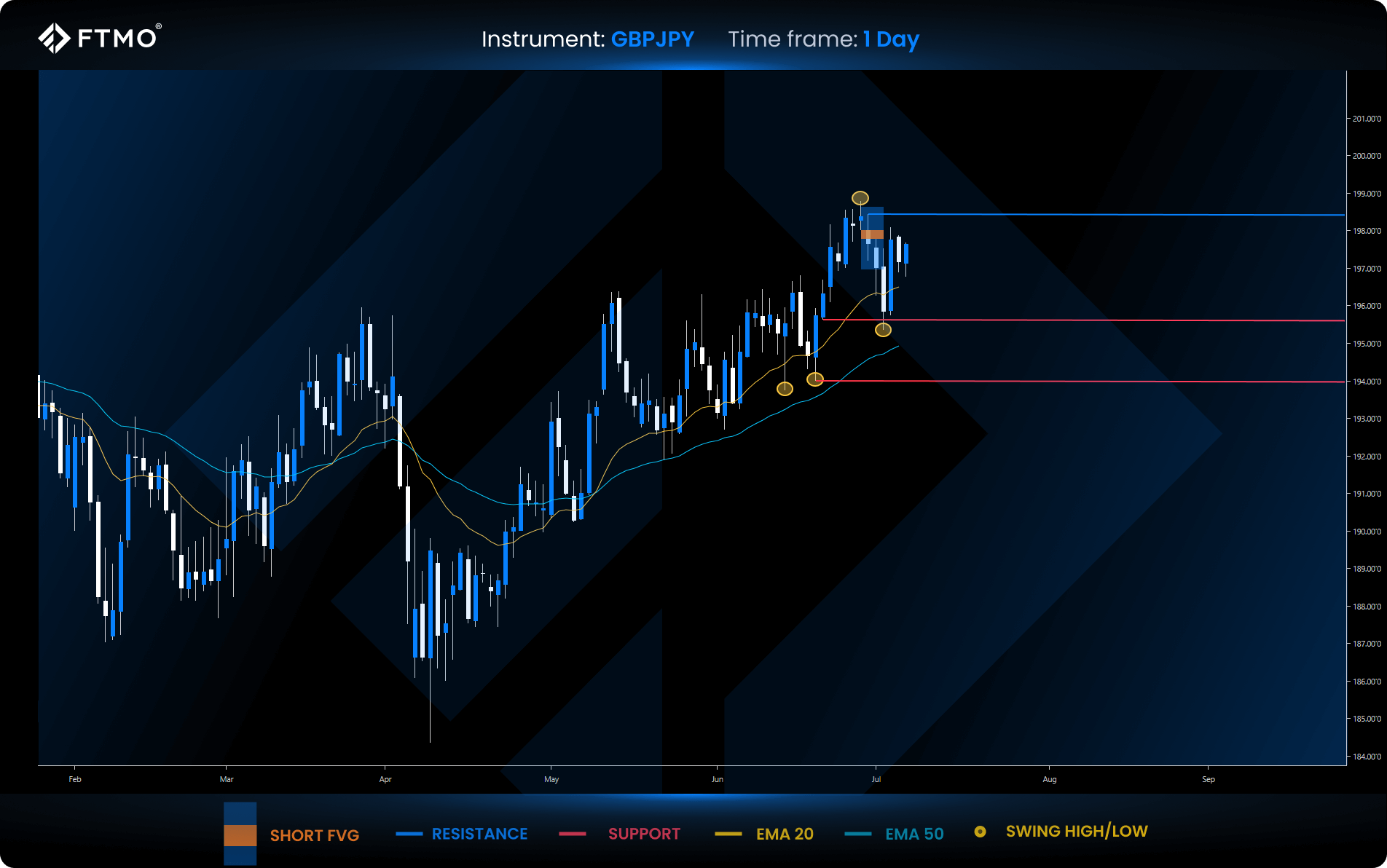 Market Context: Despite holding above support and the 20 EMA, GBPJPY still sits inside a valid bearish FVG. No new FVGs this week, and price is showing signs of a pullback.