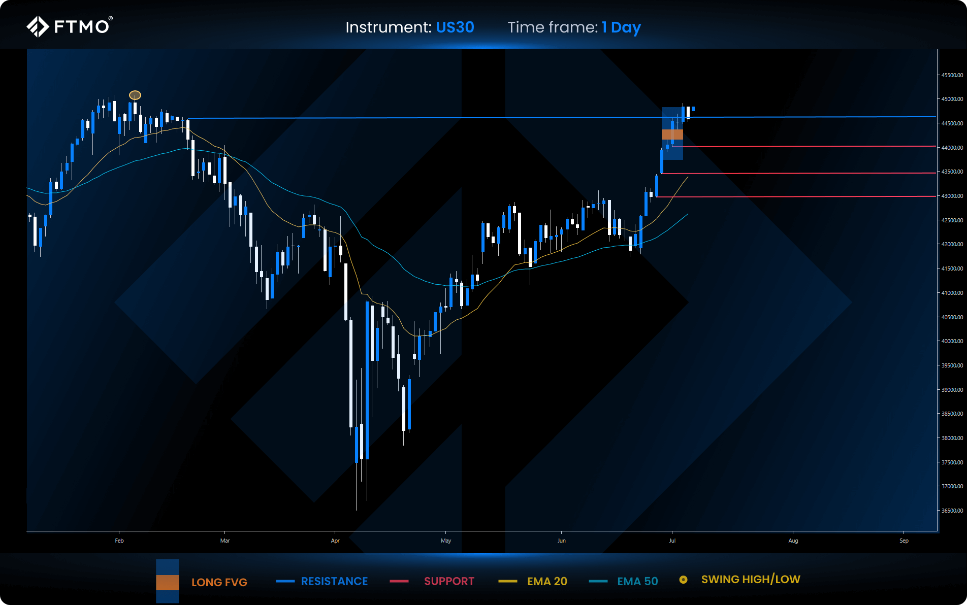 Market Context: The index continues its strong rally, pushing above resistance and showing no signs of slowing. Momentum remains bullish, and last week’s FVG is still valid until July 7.