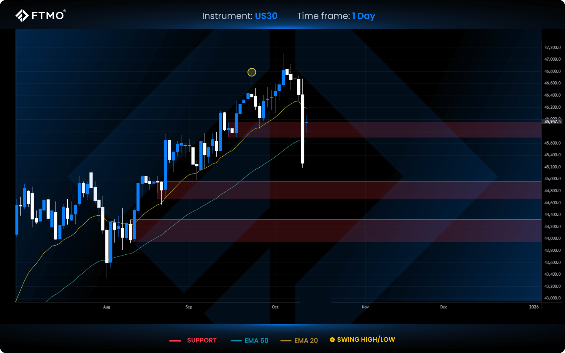 Market Context: US30 saw a sharp reaction to remarks from President Trump. Today’s open suggests signs of recovery, but the next few sessions will be critical in confirming whether the move was just a liquidity sweep or the start of a broader correction.