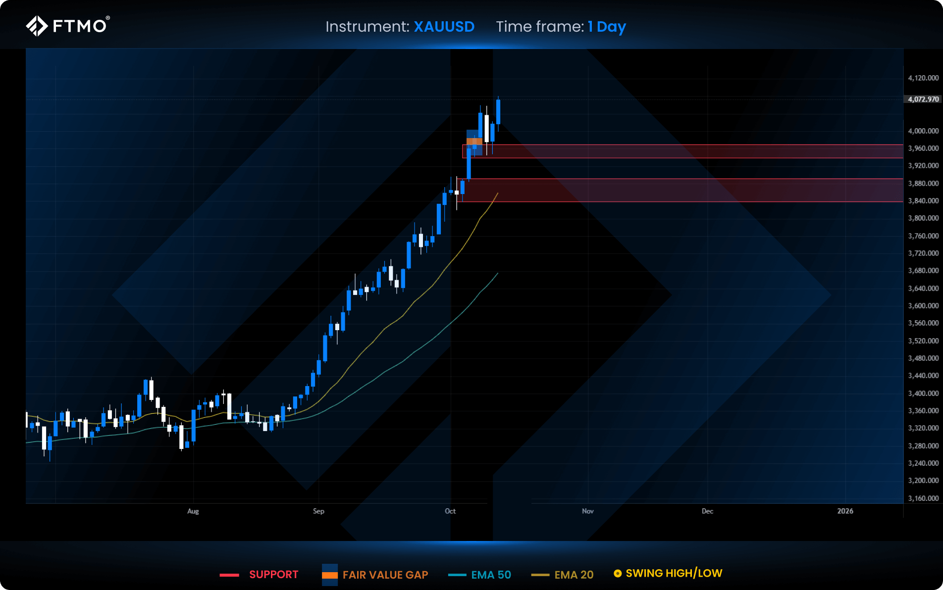 Market Context: Gold has printed yet another all-time high, continuing its extraordinary bullish run. Friday’s dip was a reaction to comments by former President Trump regarding tariffs, but the market quickly recovered, reaffirming bullish strength.