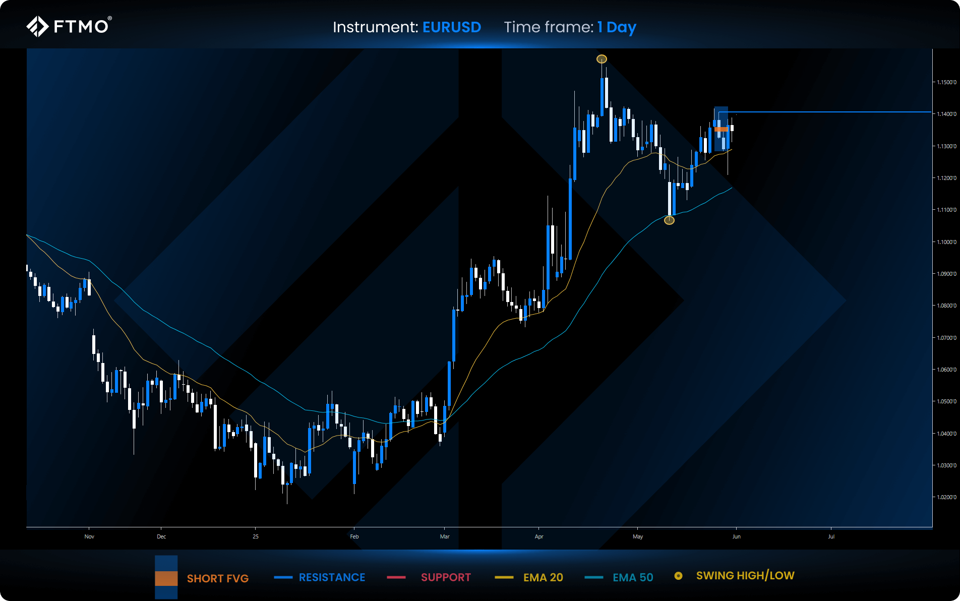 Market Context: EURUSD remains firmly in a long-term uptrend, with last week’s price action supporting that structure. A brief corrective move led to the formation of a short FVG, which is still active. Following the setup, the price dropped into the 20 EMA, where a strong bullish reaction reignited upward momentum.