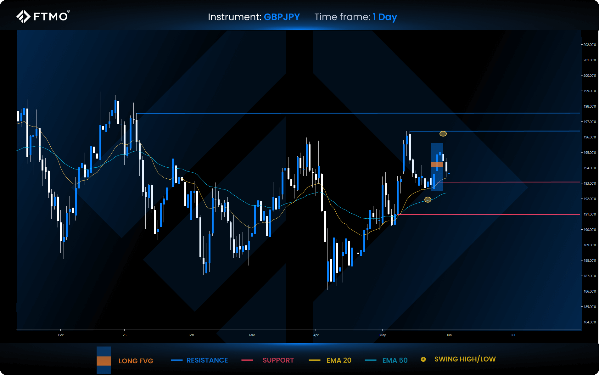 Market Context: GBPJPY is currently trading above both the 20 and 50 EMAs, confirming a bullish market structure. A valid long FVG setup formed last week and remains in play, supporting the ongoing upward move.