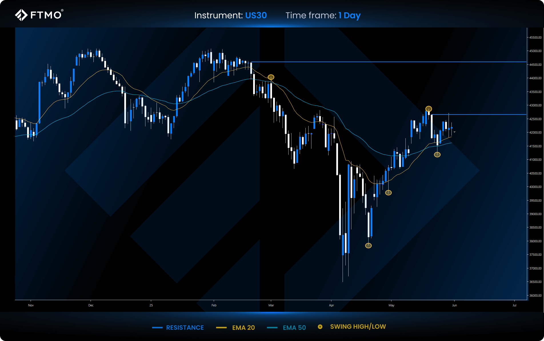 Market Context: Similar to gold, US30 lacked decisive movement last week, staying in a consolidation range. However, the bullish momentum remains intact as the price continues to hold above both EMAs.