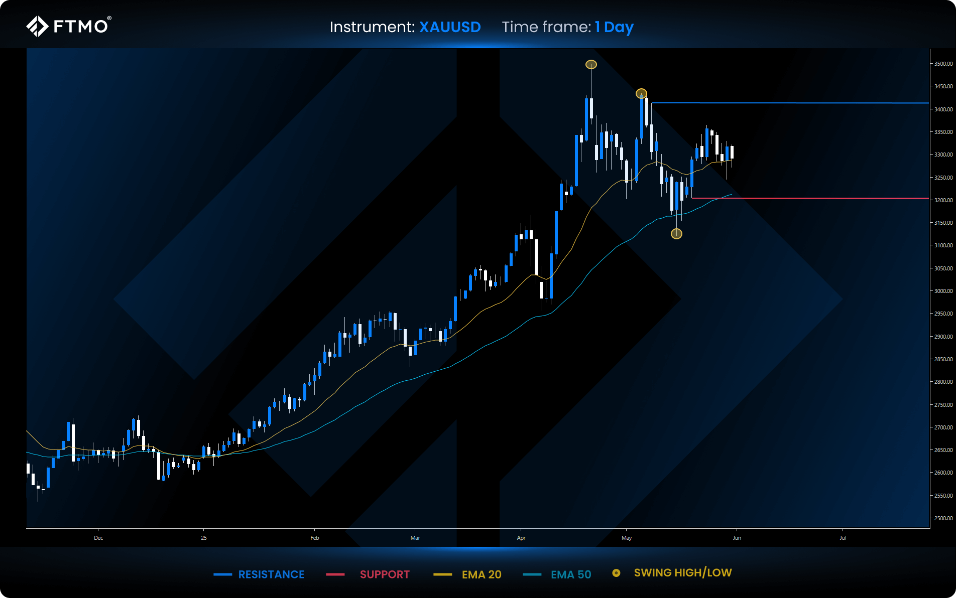 Market Context: Despite major macroeconomic events, gold spent last week in tight consolidation with no clear directional breakout. However, the price remains above both EMAs, maintaining a technically bullish outlook.