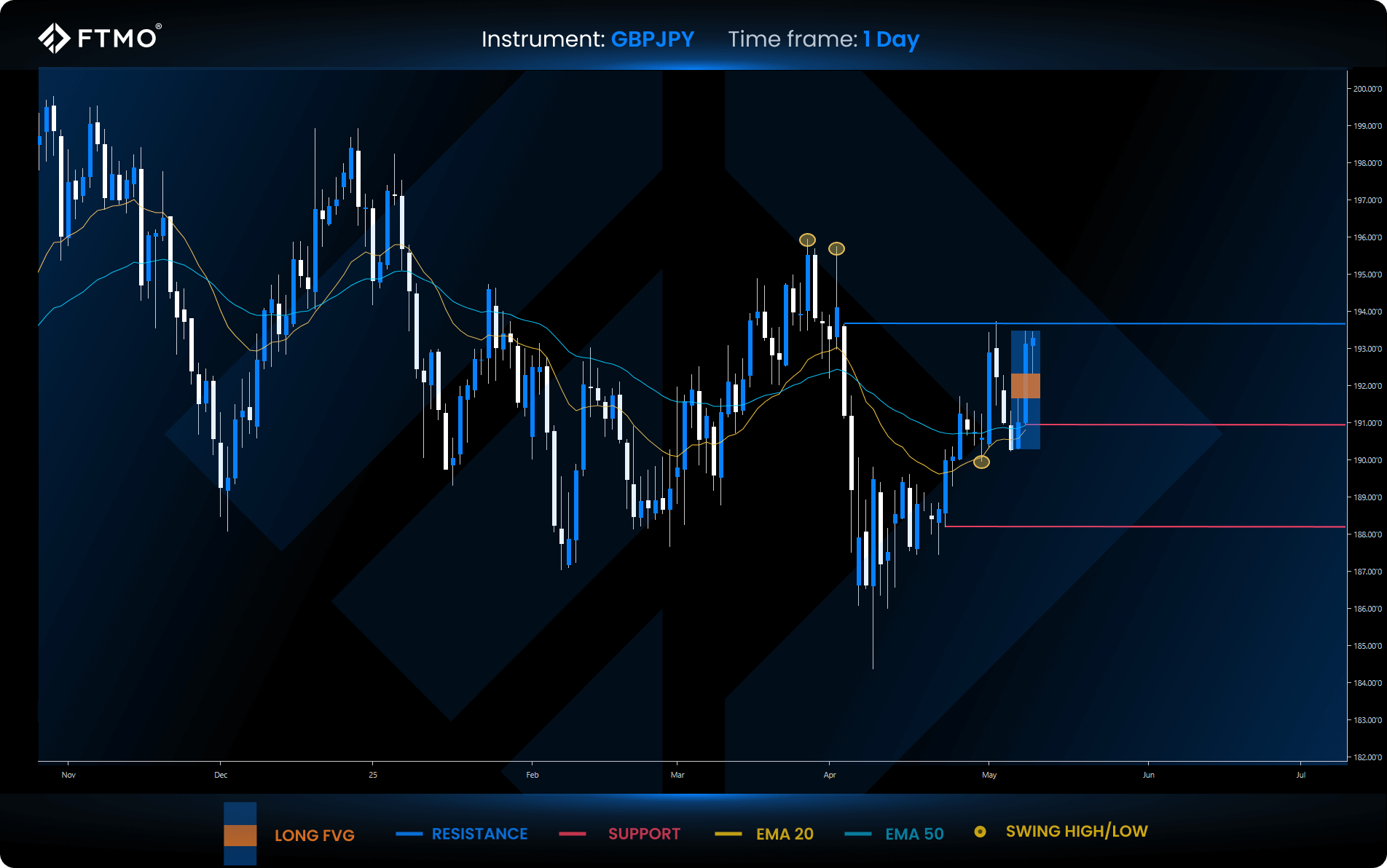 Market Context: GBPJPY trades above both 20 and 50 EMAs, confirming a strong bullish structure. Price action favours further upside after rebounding from short-term support.