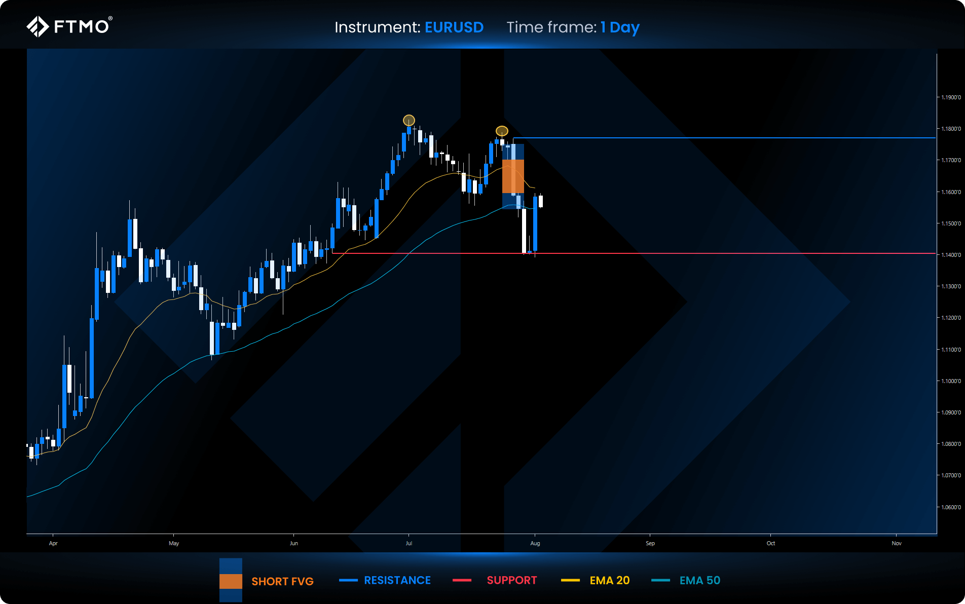 Market Context: After last week’s spike in volatility across major FX pairs, the euro sold off sharply and filled key liquidity zones within previous Fair Value Gaps (FVGs). The pair now trades between the 20 and 50 EMAs, which form an area of dynamic resistance.
