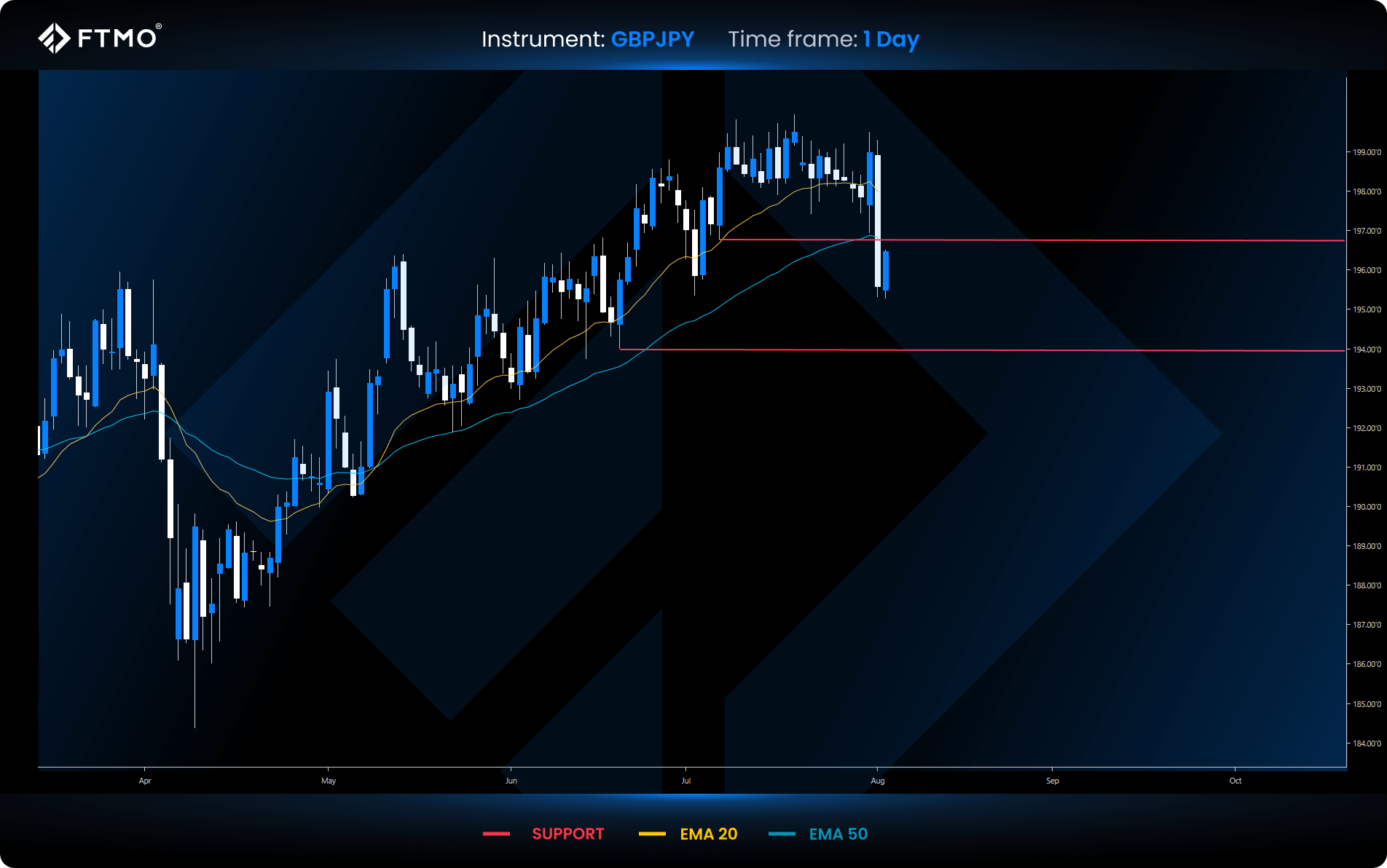 Market Context: Last week’s shift in momentum turned this pair decisively bearish. Price moved below both the 20 and 50 EMAs and currently holds beneath resistance. With August seasonality historically favouring the downside, sellers may remain in control.
