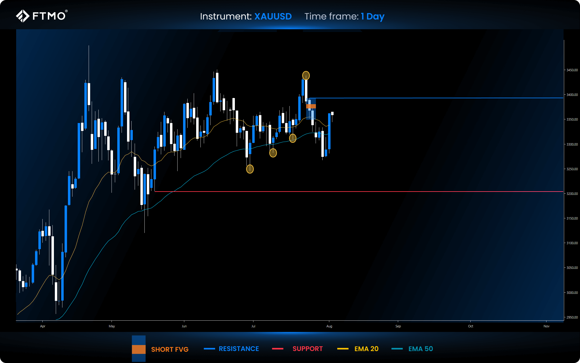 Market Context: Gold cleared two swing lows last week following an aggressive sell-off that flushed liquidity from the lower range. The recovery lifted the price above the 20 and 50 EMAs, and it now approaches an unfilled FVG left behind by a previous high.