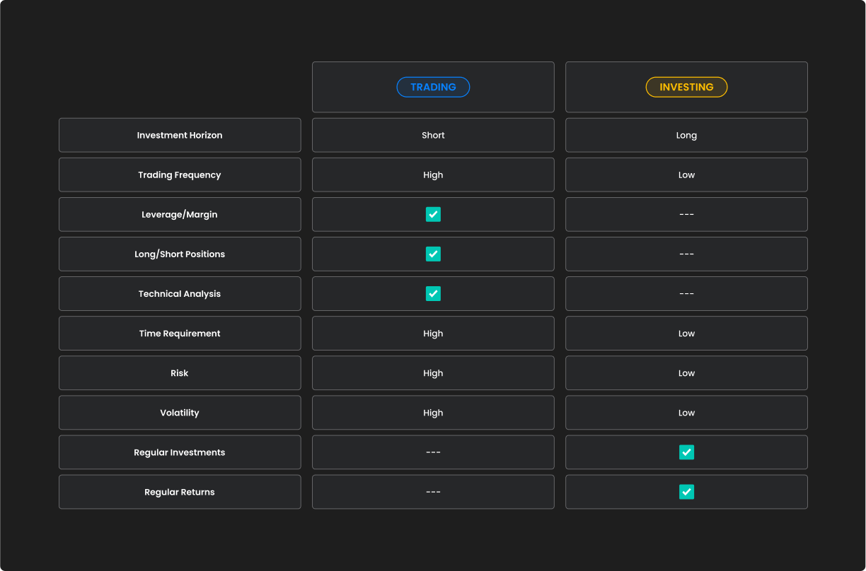 De nombreuses personnes confondent le trading et l'investissement, mais il existe des différences fondamentales. La différence entre le trading et l'investissement réside, entre autres, dans la manière dont vous réalisez un profit et dans le fait que vous deveniez ou non propriétaire de l'actif.
