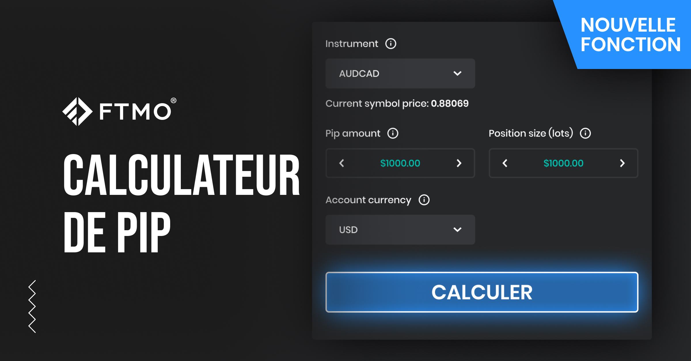 La dernière innovation parmi nos applications de trading est le Calculateur de Pip, grâce auquel les FTMO Traders tradant sur le Forex n'ont plus besoin d'utiliser des formules pour calculer la valeur de leur position et convertir le résultat dans la bonne devise du compte. Entrez simplement la paire de devises, la taille de la position en lots que le trader souhaite ouvrir, le nombre de pips et le montant résultant sont immédiatement disponibles. Bien sûr, la devise du compte est utilisée, éliminant tout nouveau calcul si la paire de devises est différente de la devise du compte.