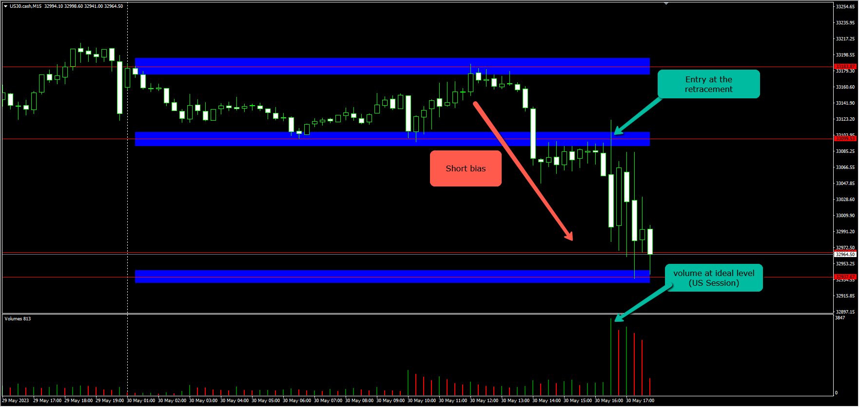 Example: La liquidité en termes de volume peut être parfaitement illustrée par l'image du graphique ci-dessous. Instrument : US30.cash
