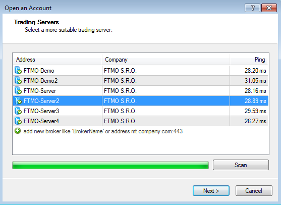 Se il tuo server non viene visualizzato al primo tentativo, fai clic sulla riga sotto i server disponibili, digita FTMO e fai clic su Scansione. Dovrebbero comparire tutti i server su cui FTMO consente attualmente di operare. Se il tuo server non appare o non riesci a connetterti, prova di nuovo (o anche più tentativi finché il server corretto non appare nell'elenco).