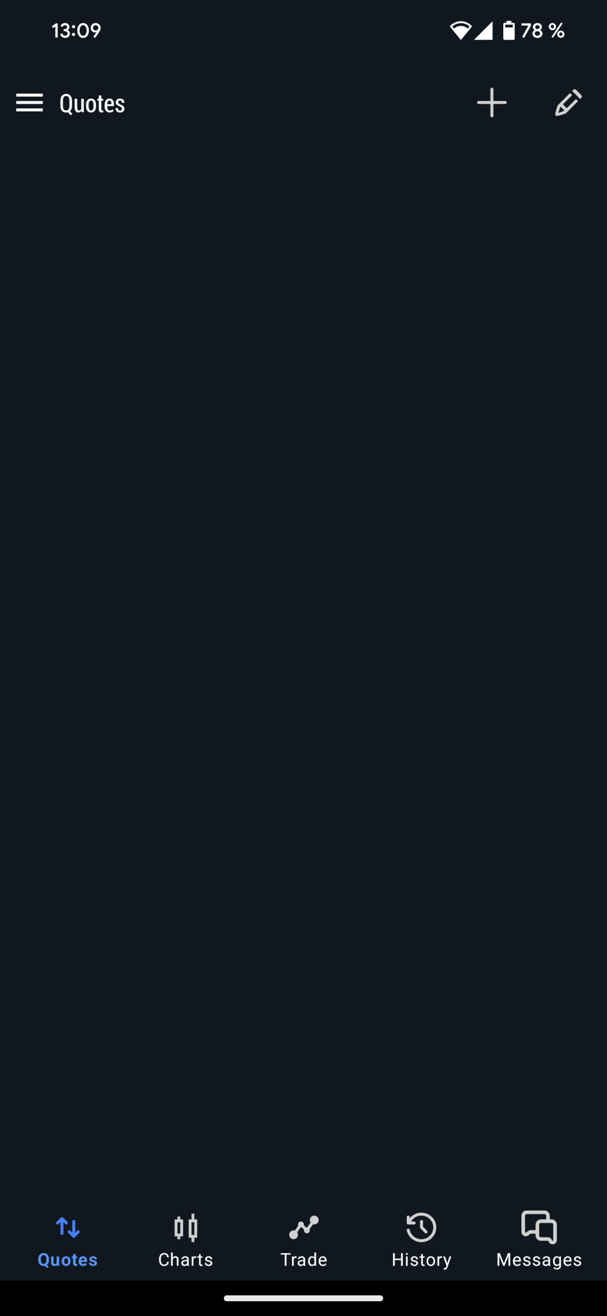 Dopo aver installato la MT4 sul tuo telefono Android, verrai automaticamente configurato con un conto demo di MetaQuotes. Non effettueremo l'accesso a questo conto. Quando si apre l'applicazione, viene visualizzata la finestra delle quotazioni in cui si fa clic sul menu nell'angolo in alto a sinistra.