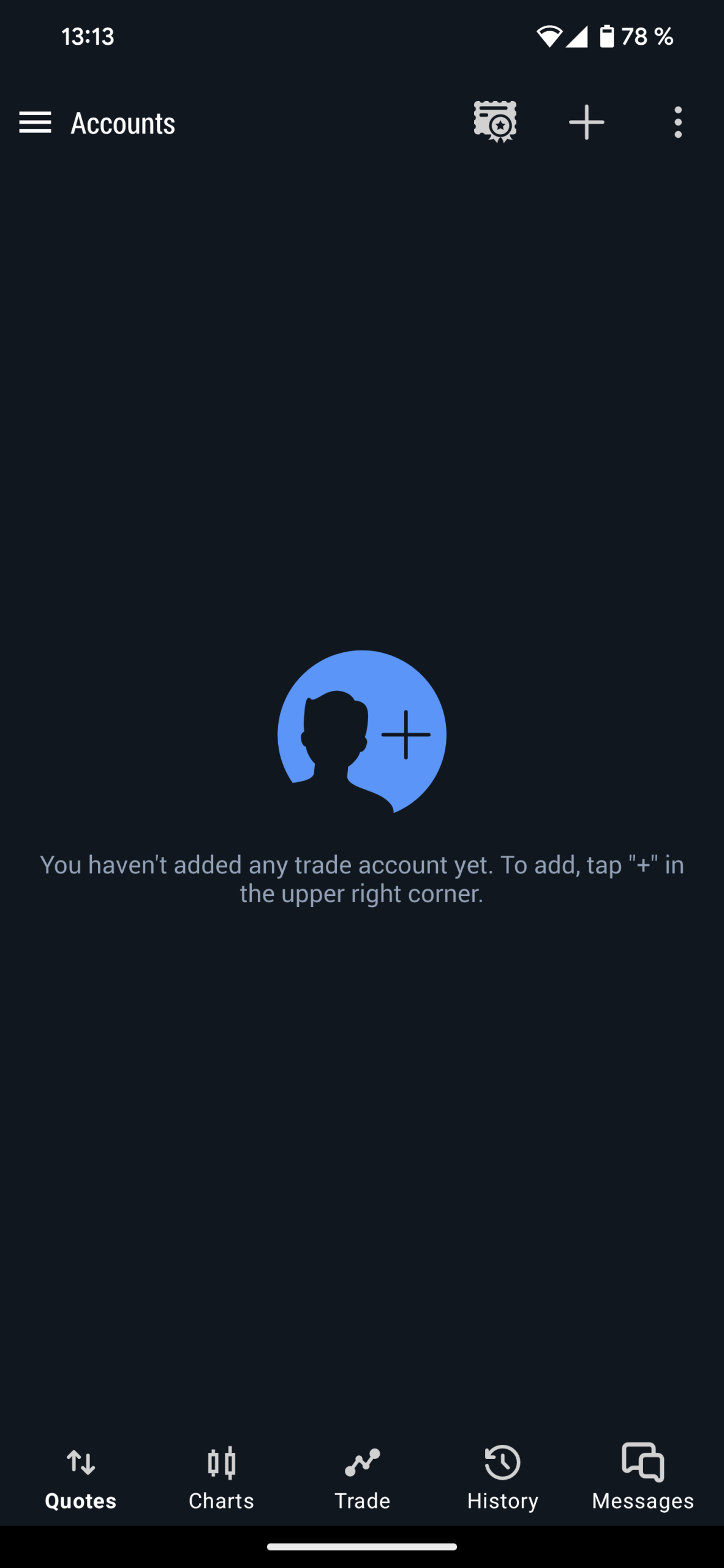 Nella finestra successiva, è possibile vedere il conto demo preinstallato di cui sopra e fare clic sul segno più in alto a destra.