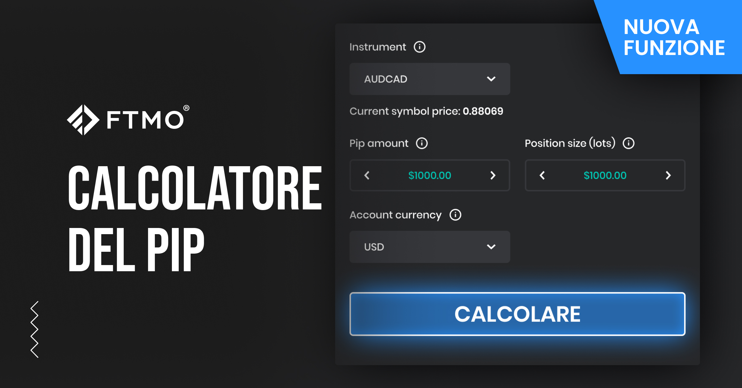 L'ultima innovazione tra le nostre applicazioni di trading è il calcolatore di pip, grazie al quale i trader FTMO che operano sul mercato Forex non devono più utilizzare formule per calcolare il valore della loro posizione e convertire il risultato nella valuta corretta del conto. Basta inserire la coppia di valute, la dimensione della posizione in lotti che il trader vuole aprire, il numero di pip e l'importo risultante è immediatamente disponibile. Naturalmente, viene utilizzata la valuta del conto, eliminando ulteriori ricalcoli se la coppia di valute è diversa dalla valuta del conto.