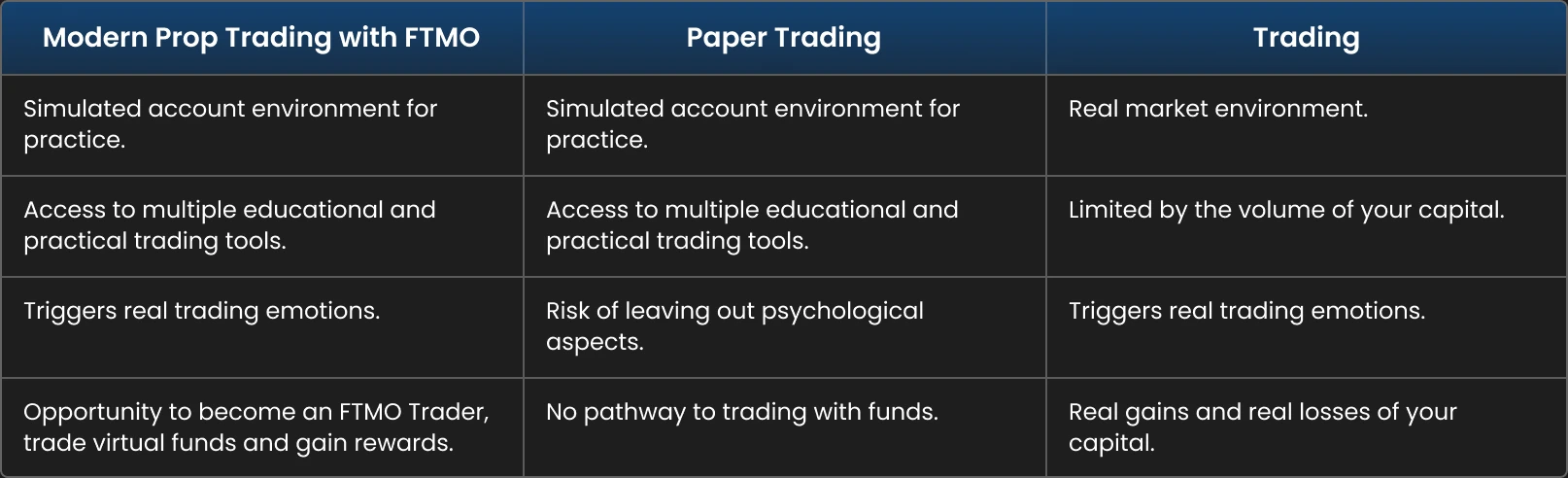 Embora o paper trading e o Prop Trading Moderno permitam negociar sem arriscar capital pessoal, os seus objetivos são diferentes. O paper trading é puramente educacional, oferecendo um ambiente simulado e sem riscos para praticar estratégias. No Prop Trading Moderno, também pode testar o seu plano de trading, mas se os seus resultados forem bons, receberá recompensas dos seus lucros simulados. Encontrará alguns pontos-chave resumidos e comparados com o trading no ambiente de mercado real abaixo.