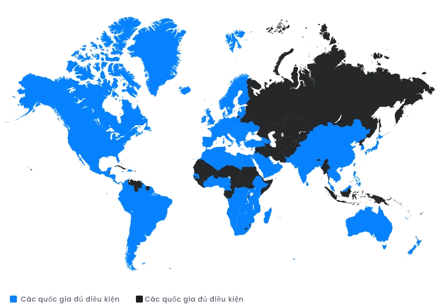 Bản đồ cung cấp cho các bạn sự mô tả về tính khả dụng của dịch vụ, trong đó các quốc gia đủ điều kiện tham gia được đánh dấu màu xanh lam. Điều này có liên quan đến các quyết định kinh doanh nội bộ và những thay đổi trong việc tuân thủ các quy định và tiêu chuẩn pháp lý đang hiện hành:
